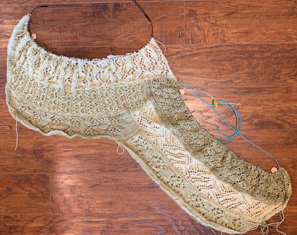 Hopefully I am able to continue this trajectory into March and the rest of the year. I am really enjoying watching the shawl take shape, and I am loving the gentle color changes in my beautiful green Sandy Sock trios; though, admittedly, when I see my mom’s work in progress, I get a bit jealous at how much neater hers is! I have a few more “fudges” in mine. I’m hoping my granny is right and, as she (apparently) always says, “that $%*& will block right out.”